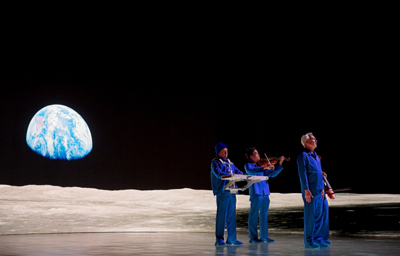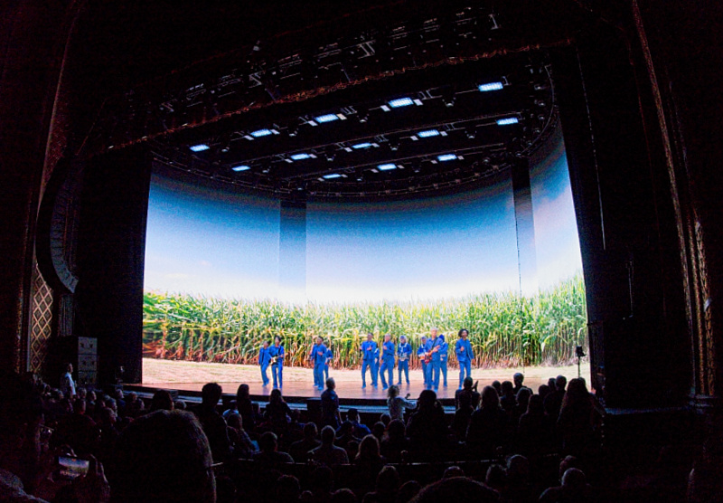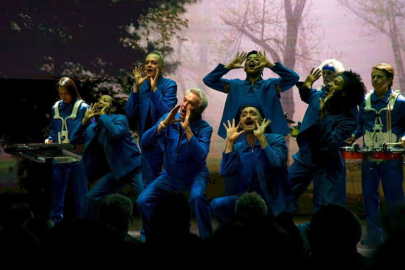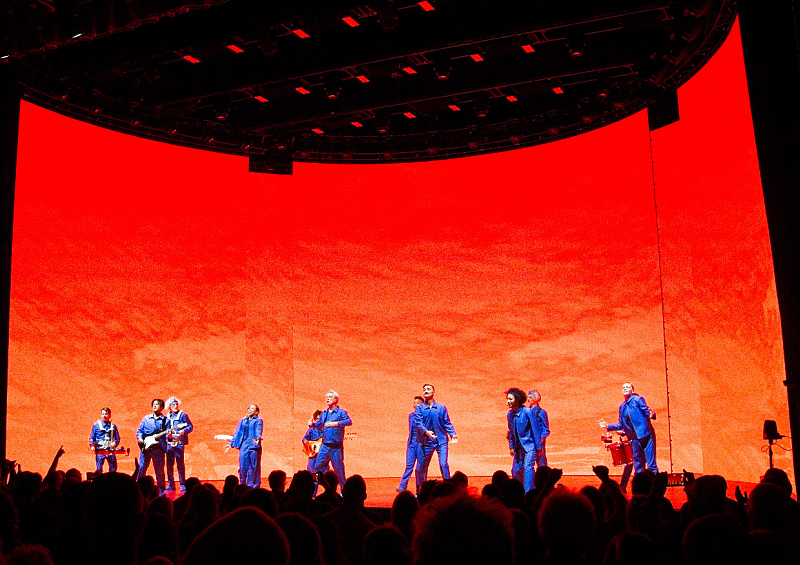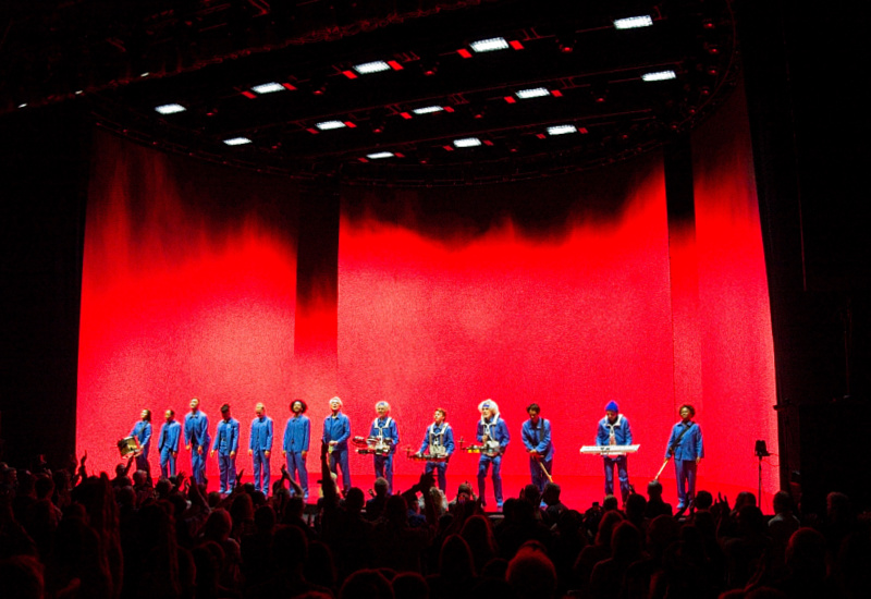 The most dramatic visual evolution from his previous tour is the introduction of a giant, curved video backdrop. This screen is not used for typical close-ups or jarring visual chaos; instead, it provides ethereal, responsive environments that redefine the physical space. During the tender performance of “This Must Be the Place (Naive Melody),” the stage transforms into a tranquil, countryside field, bathing the moving figures in soft, natural light. Conversely, tracks like “Houses In Motion” drive the audience through a blurred, impressionistic nighttime city street, with the geometric movements of the cast slicing through the digital environment. This duality, the organic movement of humans against the stark, artistic projection, is visually stunning.